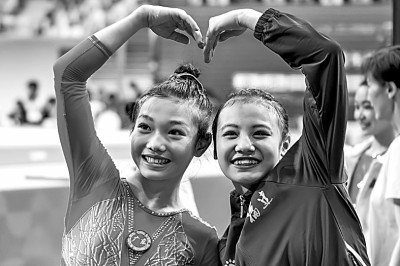 11月15日,广东队选手柯沁沁(左)与福建队选手邱祺缘在比赛后向观众致意。新华社记者 杜子璇摄