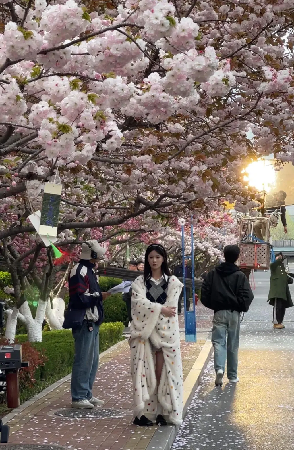 春日的黄海学院樱花大道繁花盛放,粉白花瓣随风飘落,与剧组搭建的现代都市场景相映成趣。记者在现场看到,剧组正在拍摄一组室外戏份,主演沉思与孟娜在樱花树下对戏,自然流露的互动状态让不少围观群众直呼“氛围感拉满”。作为青岛本地极具代表性的春日打卡地,樱花场景不仅契合剧中重逢与心动的剧情设定,也将青岛的春日浪漫风光自然融入镜头之中。