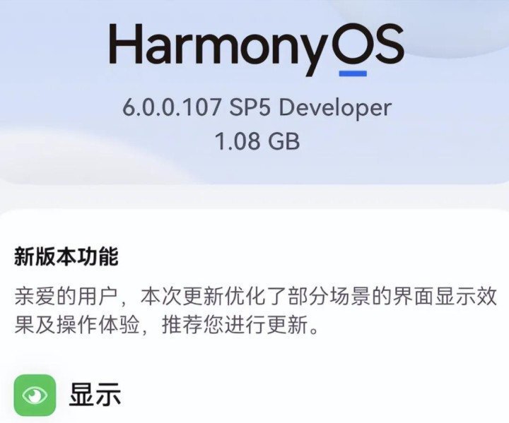 首先是版本与包体信息先行披露,官方已推送了 HarmonyOS6.0.0.107 SP5,安装包体量约 1.08GB,面向开发者与尝鲜用户的测试版此前已有多批次覆盖。