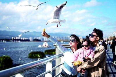 云南昆明出台《昆明市文明观赏红嘴鸥规定》保护红嘴鸥。图为游客在昆明市海埂大坝投喂红嘴鸥。新华社发