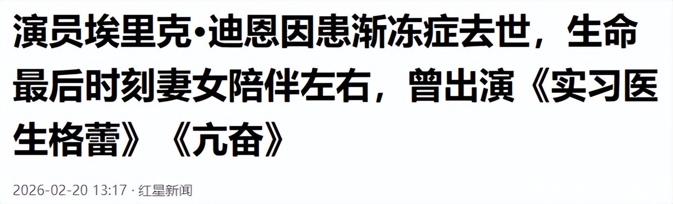 当地时间2月19日,美国著名演员埃里克・迪恩因肌萎缩侧索硬化症(ALS)引发多器官衰竭,在洛杉矶家中离世,年仅53岁。