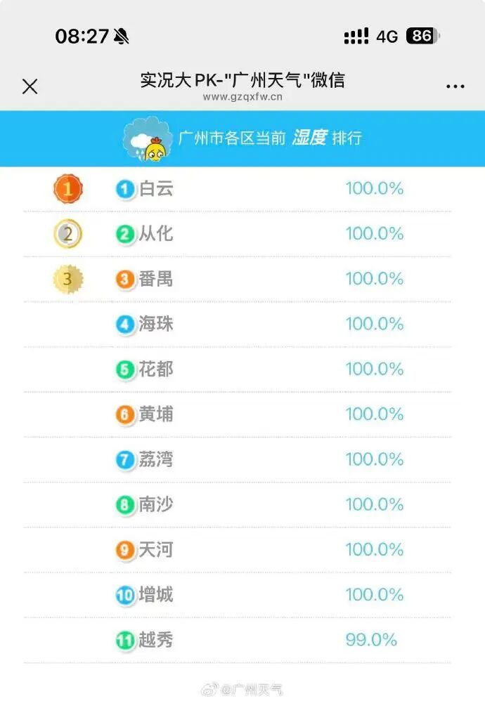 3月2日早晨,广州多区湿度“爆表”。图/@广州天气