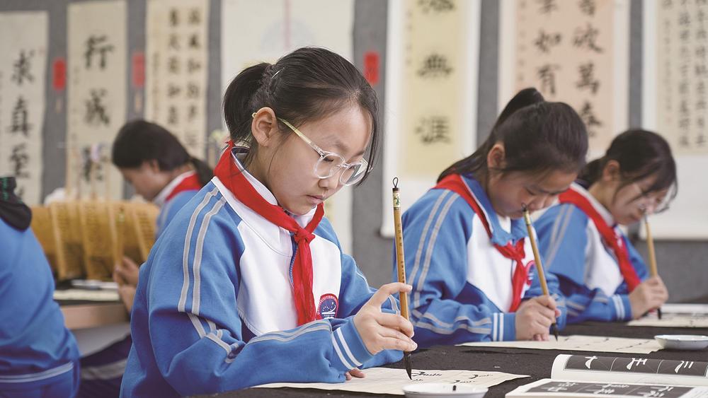 图为书法社团的孩子们一笔一画练功底免费配资炒股配资平台,以专注书写热爱。 郭强 摄