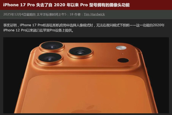尽管摄像头硬件全面升级,最近,苹果官方一份支持文档显示,此前相机应用中的一项功能已被悄然移除,将在人像模式下无法再启用夜景模式。