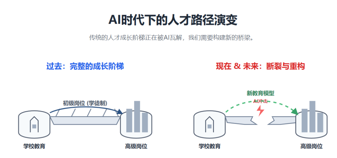 当一家公司可以用极低的成本,让AI完成90%的初级工作时,雇佣一个需要支付薪水、需要耗费心力去培养、且效率远低于AI的人类新手,在商业逻辑上变得越来越不划算。(情怀恐怕无法对冲这种本质性变化)