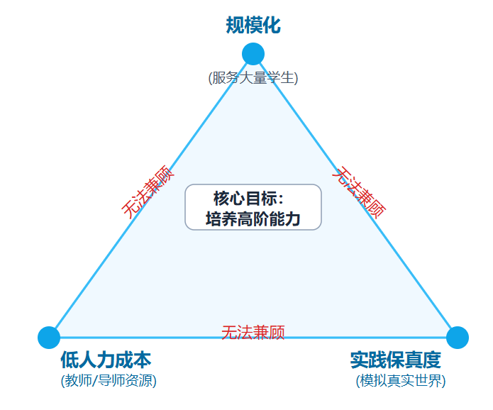过去模式的核心是“教师授课-学生听讲-有限实践”,它在知识传递上或许有效,但在培养上述高阶能力时,却陷入了一个“不可能三角”:教育的规模化、实践的保真度和教师的人力成本。