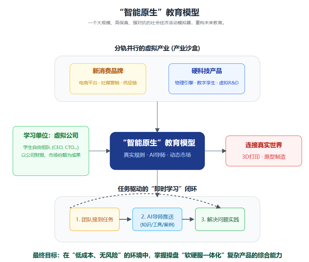 1.分轨并行的虚拟产业:在早期阶段将构建多个并行的、高度专业化的虚拟产业环境。例如,会有一个专注于“新消费品牌”的模拟世界,它内置了完整的电商平台、社交媒体营销工具链和柔性供应链系统;同时,也会有一个专注于“硬科技产品”的模拟世界,它提供了先进的物理引擎、数字孪生接口和虚拟研发实验室。每个“世界”都是一个自洽且高度仿真的产业沙盒,让学生可以沉浸在特定领域的真实挑战中。